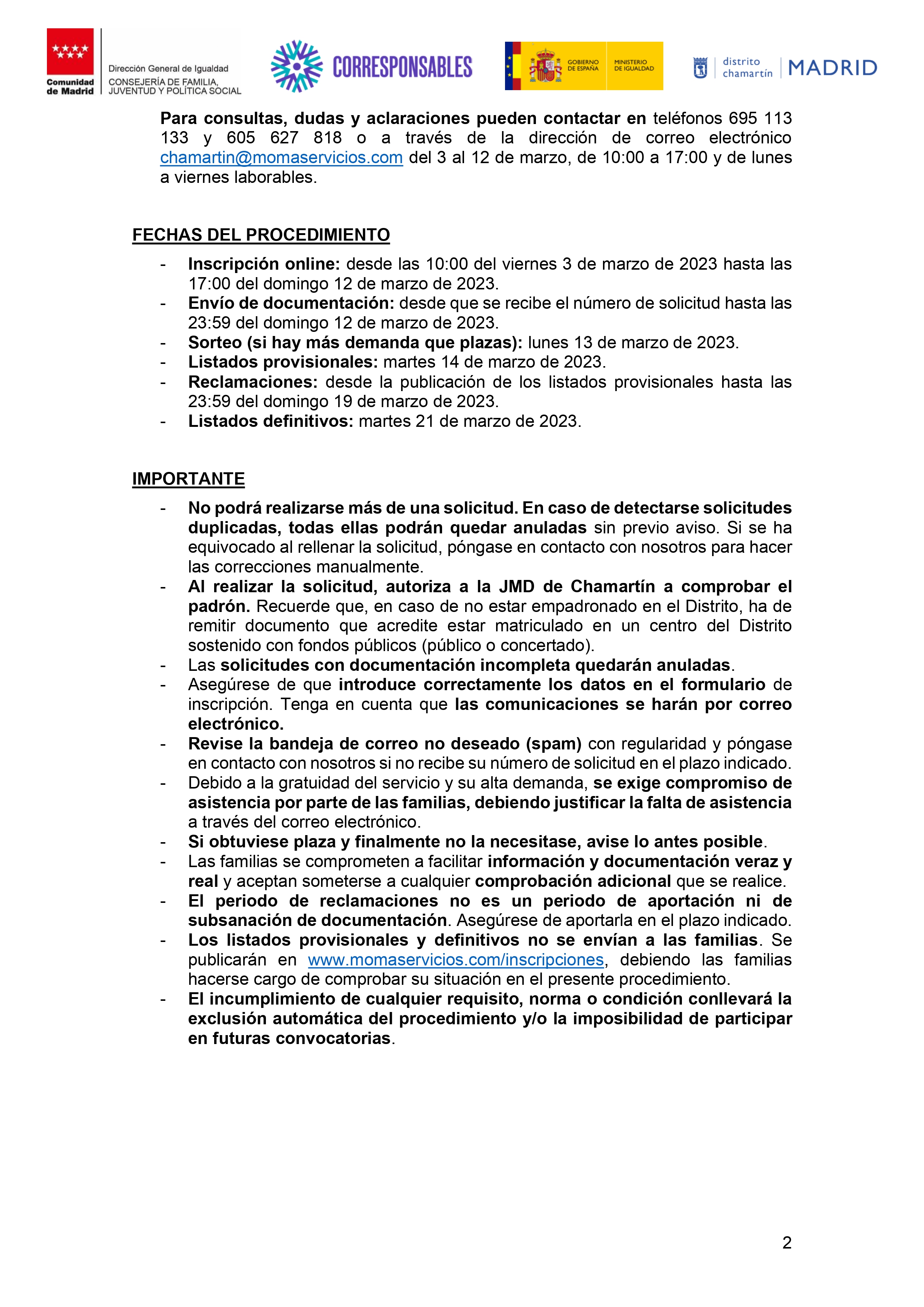 – Sorteo (si hay más demanda que plazas): lunes 13 de marzo de 2023.
