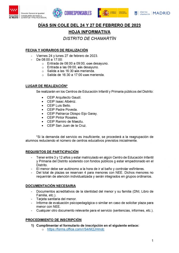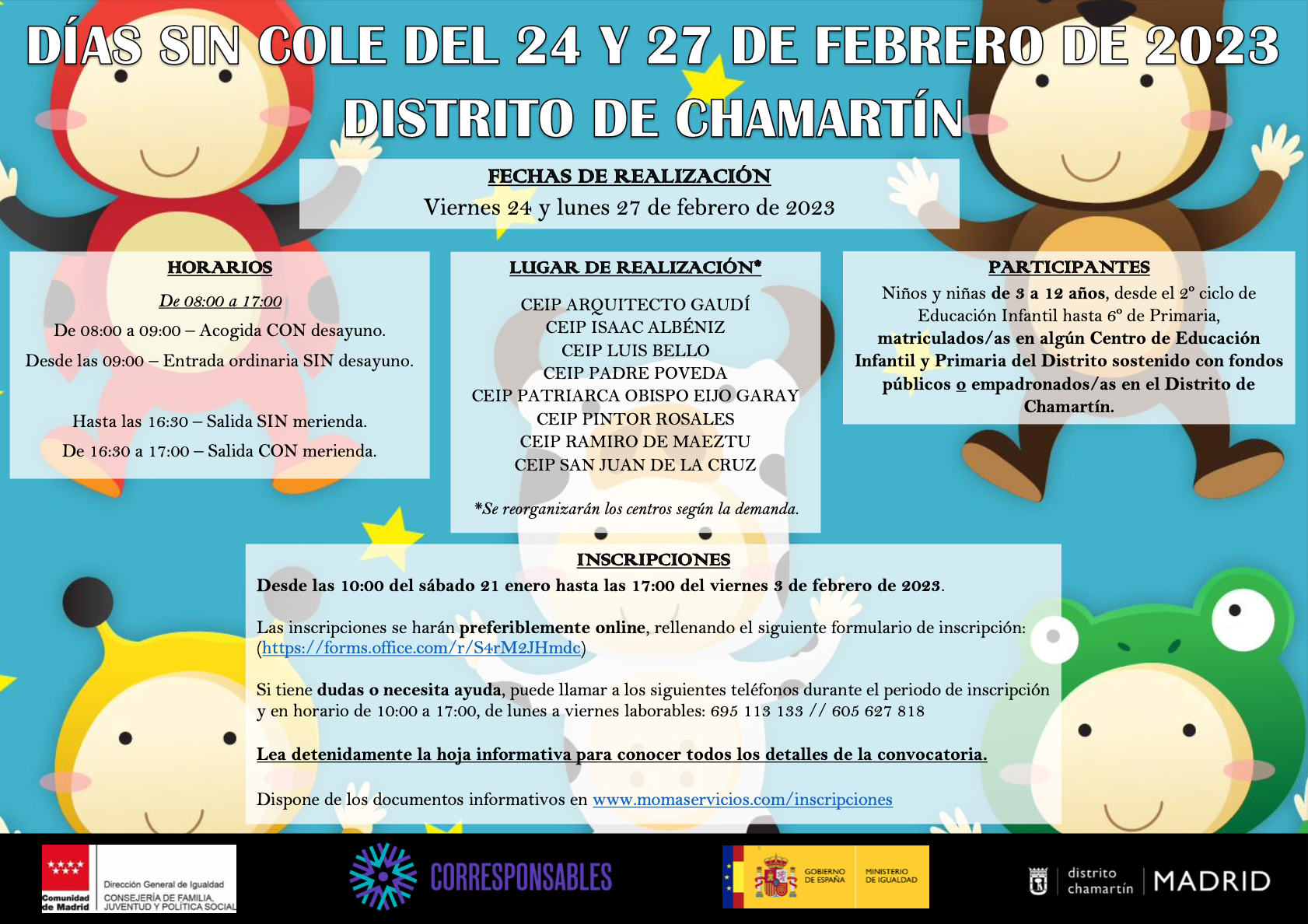 Desde la Junta del Distrito de Chamartín se informa de la actividad: Días sin cole 24 y 27 de febrero