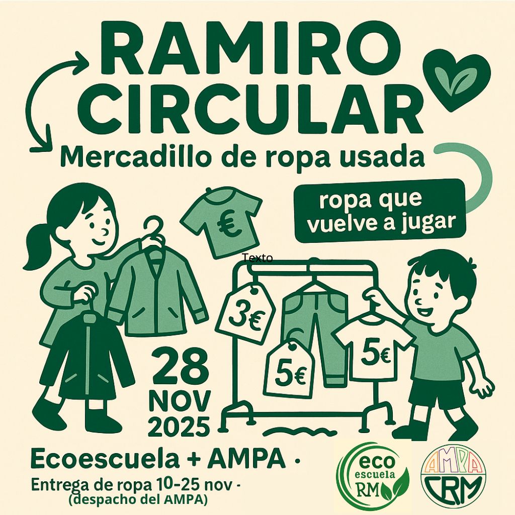 El viernes 28 de noviembre, de 16:00 a 18:00, celebraremos en el colegio un mercadillo circular de ropa para dar segunda vida a prendas de Infantil, Primaria y equipaciones de extraescolares. La recaudación se destinará íntegramente a la renaturalización del patio (plantones, tierra, sustratos y acolchados, y especies vegetales). La actividad se enmarca en la Semana Europea de la Prevención de Residuos.